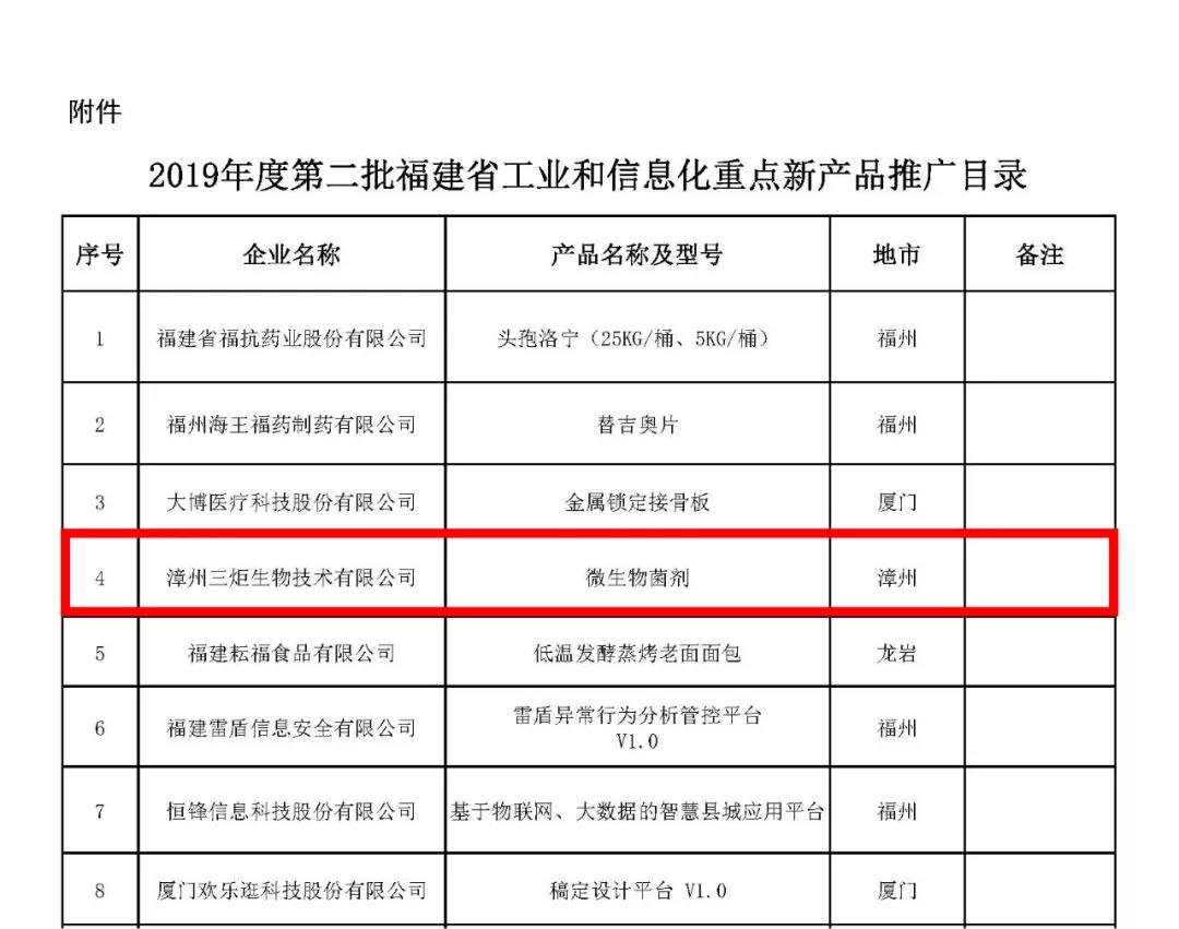 [三炬新聞]三炬微生物菌劑獲得2019年福建省工業和信息化重點新產品稱號
